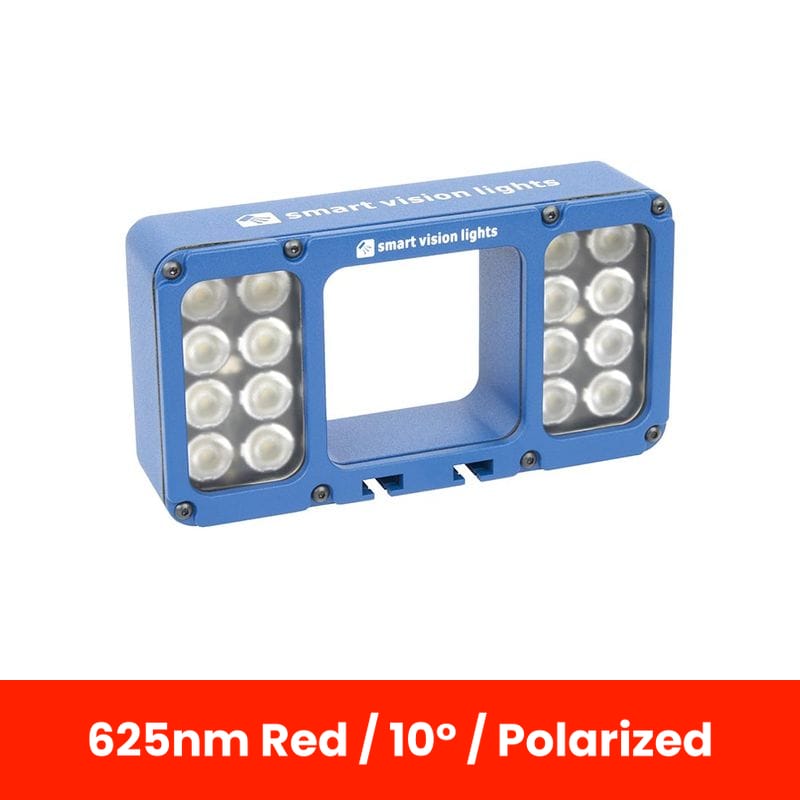 The JWL150-DO-625-N10-LPI bright field ring light features SVL's Deca OverDrive with up to 10x the standard light output. It is specially designed for the logistics industry to provide maximum illumination. It is compatable with many machine vision cameras and can be mounted directly to camera housings using the optional mounting plate accessories. It is designed to provide extra illumination where a camera's internal source is insufficient, and with a working range of 500mm to 2000mm it can provide illumination even over large distances. This fixture can be directly controlled via the camera's trigger output. The JWL150-DO-625-N10-LPI is in the 625nm Red color, features a lens beam angle of 10 Degree and is Polarized. The JWL150 series is available in White, 470nm Blue, 625nm Red, and 850nm IR wavelength variants and 10°, 14°, and 30° lens angles. It can be configured with a factory-installed polarizing filter for increased robustness compared to a field-installed filter.