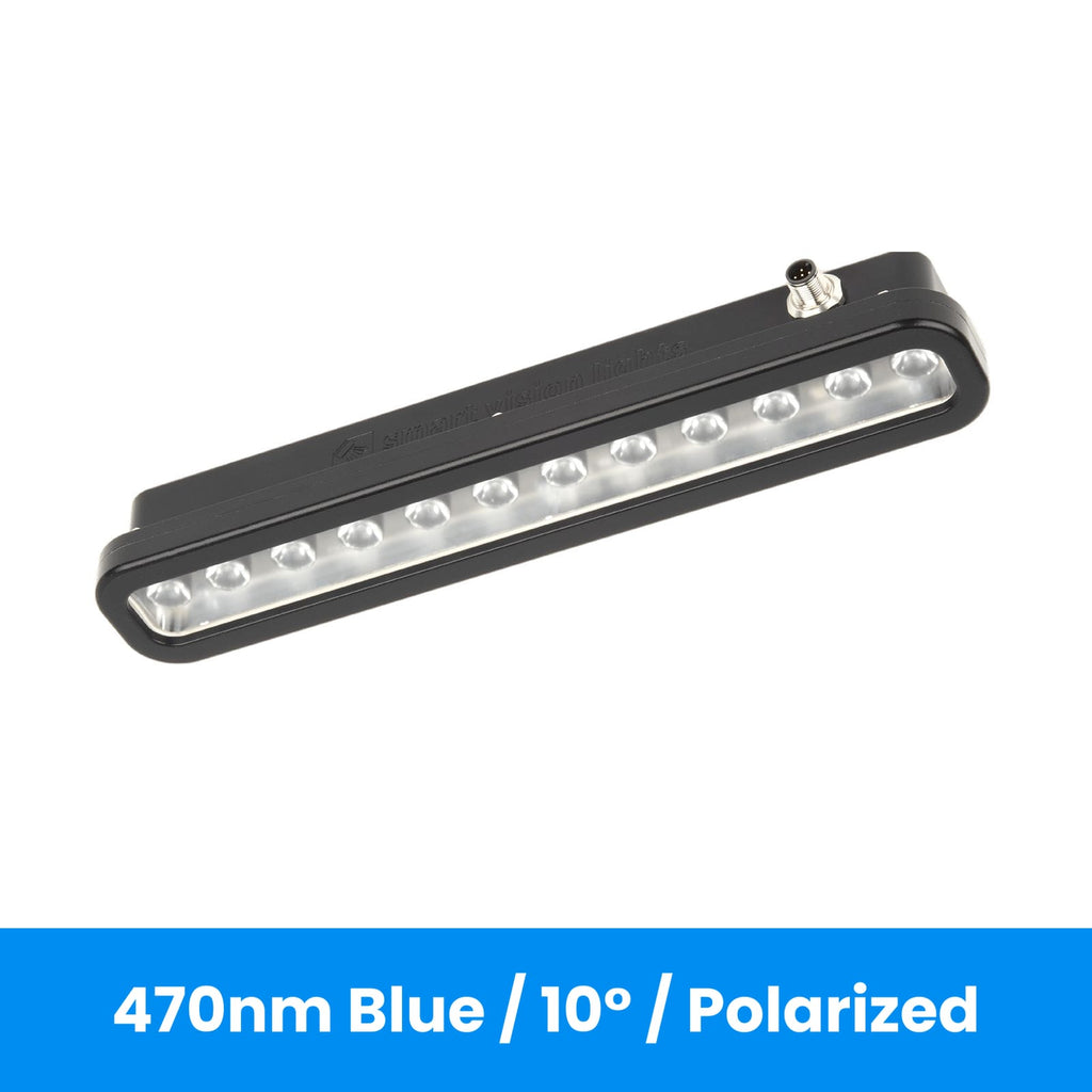 The LZEW300-NS-SC-470-N10-LPI Bar light from Smart Vision Lights is part of SVL's LZEW series, which is one of Smart Vision Lights modern direct connectable bar linear lights. This variant has an FDA-compliant non-stick coating and is IP69K rated and waterproof for food industry or other applications requiring washdown. This light can be purchased as single connection or daisy chain types, which allow for various implementation options. This machine vision light incorporates SVL's patented NanoDrive Driver which allows for operation in both Constant-On or Overdrive Strobe operation modes in one convenient light, as well as rapid strobe speeds with on-times of less than 500 NanoSeconds. In addition to this control, the LZEW300 series is also zoned, featuring 3 different zones which can individually have their intensities controlled using the BTM-1000 programming module in conjunction with the SmartVisionLink App. This model is 300mm long and is in the 470nm Blue color. The LZEW300-NS-SC-470-N10-LPI features a lens beam angle of 10 Degree and is Polarized. To Daisy Chain the LZEW300 series, the LZEW300-DC variant is required.