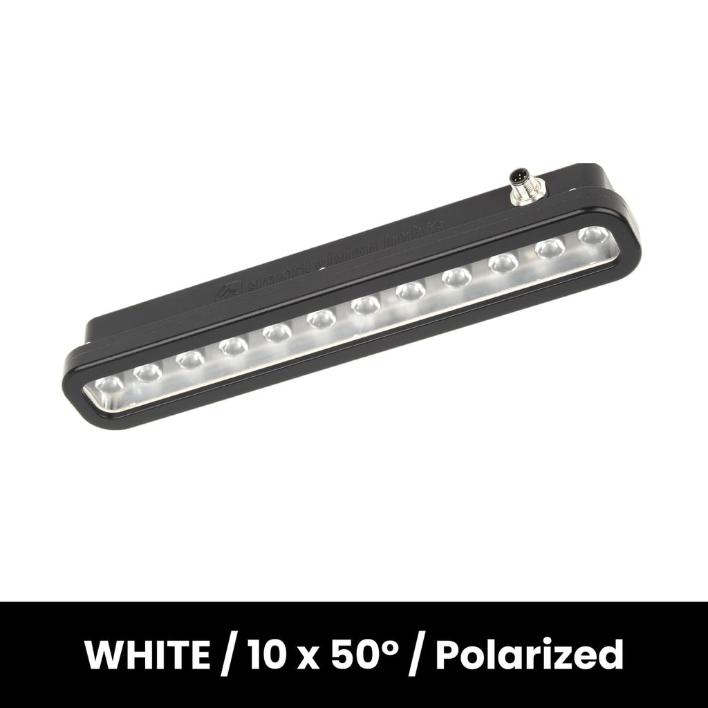 The LZEW300-NS-SC-WHI-L10-LPI Bar light from Smart Vision Lights is part of SVL's LZEW series, which is one of Smart Vision Lights modern direct connectable bar linear lights. This variant has an FDA-compliant non-stick coating and is IP69K rated and waterproof for food industry or other applications requiring washdown. This light can be purchased as single connection or daisy chain types, which allow for various implementation options. This machine vision light incorporates SVL's patented NanoDrive Driver which allows for operation in both Constant-On or Overdrive Strobe operation modes in one convenient light, as well as rapid strobe speeds with on-times of less than 500 NanoSeconds. In addition to this control, the LZEW300 series is also zoned, featuring 3 different zones which can individually have their intensities controlled using the BTM-1000 programming module in conjunction with the SmartVisionLink App. This model is 300mm long and is in the WHITE color. The LZEW300-NS-SC-WHI-L10-LPI features a lens beam angle of 10 x 50 Degree and is Polarized. To Daisy Chain the LZEW300 series, the LZEW300-DC variant is required.