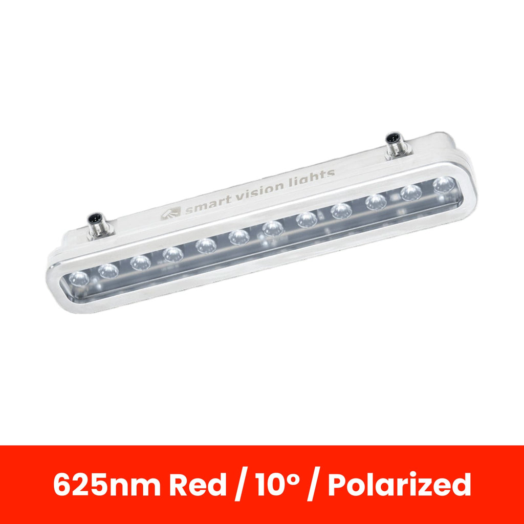 The LZEW300-SS-DC-625-N10-LPI Bar light from Smart Vision Lights is part of SVL's LZE series, which is one of Smart Vision Lights modern direct connectable bar linear lights. This variant has a stainless steel housing and an IP69K rating. The LZEW300 is waterproof for use in the food industry, as well as other applications requiring washdown. This light can be purchased in single connection or daisy chain configurations, which allow for various implementation options. This machine vision light incorporates SVL's patented NanoDrive Driver which allows for operation in both Constant-On or Overdrive Strobe operation modes in one convenient light, as well as rapid strobe speeds with on-times of less than 500 NanoSeconds. In addition to this control, the LZE300 series is also zoned, featuring 3 different zones which can individually have their intensities controlled using the BTM-1000 programming module in conjunction with the SmartVisionLink App. This model is 300mm long and is in the 625nm Red color. The LZEW300-SS-DC-625-N10-LPI features a lens beam angle of 10 Degree and is Polarized. To Daisy Chain the LZE300 series, the LZE300-DC variant is required.