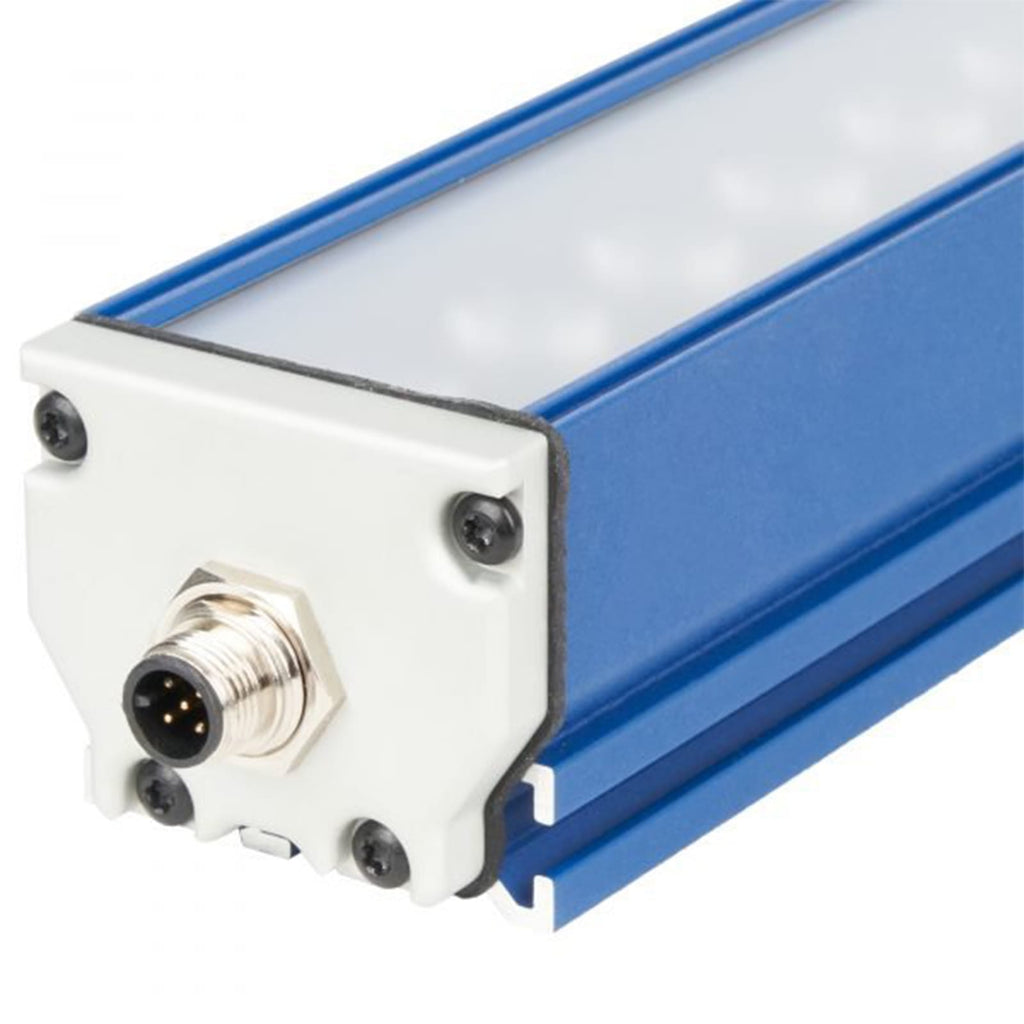 The light features a 5 Pin M12 Male Connector on the end of the light. We recomend our 5PM12 series of cables (5PM12-5, 5PM12-10, or 5PM12-15). Standard M12 cables may not be able to handle the current that these lights require