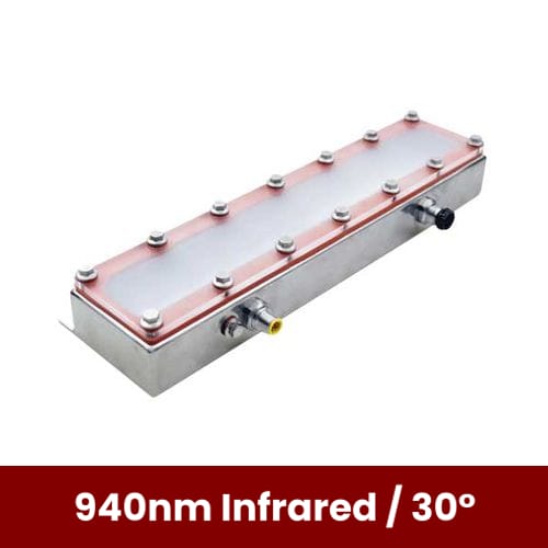 The LW300-940-W Bar light from Smart Vision Lights is their classic linear light in 300mm (12") Length, however this variation is IP68 rated and fully waterproof for use in the food industry and other applications requiring washdown with water or detergents. This machine vision light series incorporates SVL's Smart-Drive driver which allows for operation in both Constant-On and Strobe operation modes, however this light cannot be Overcurrent Strobed. For Overcurrent Strobe, we recommend the ODLW300 (Overdrive Driver). This model is 300mm long and is in the 940nm Infrared color. The LW300-940-W is Not Diffused and Not Polarized. The LW300 series is available in 470nm Blue, 530nm Green, 625nm Red, 850nm IR, and 940nm IR as standard variants. Further customizations can be performed upon request from Machine Vision Direct. The LW300-940-W has its front window replaced at the factory with a diffuser.