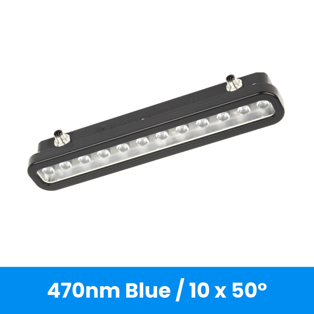 The LZEW300-NS-DC-470-L10 Bar light from Smart Vision Lights is part of SVL's LZE series, which is one of Smart Vision Lights modern direct connectable bar linear lights. This variant has an FDA-compliant non-stick coating and is IP69K rated and waterproof for food industry or other applications requiring washdown. This light can be purchased as single connection or daisy chain types, which allow for various implementation options. This machine vision light incorporates SVL's patented NanoDrive Driver which allows for operation in both Constant-On or Overdrive Strobe operation modes in one convenient light, as well as rapid strobe speeds with on-times of less than 500 NanoSeconds. In addition to this control, the LZEW300 series is also zoned, featuring 3 different zones which can individually have their intensities controlled using the BTM-1000 programming module in conjunction with the SmartVisionLink App. This model is 300mm long and is in the 470nm Blue color. The LZEW300-NS-DC-470-L10 features a lens beam angle of 10 x 50 Degree and is Not Polarized. To Daisy Chain the LZEW300 series, the LZEW300-DC variant is required.
